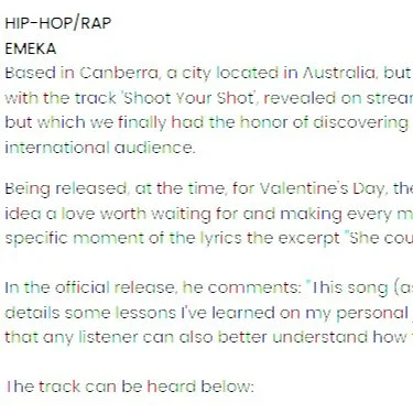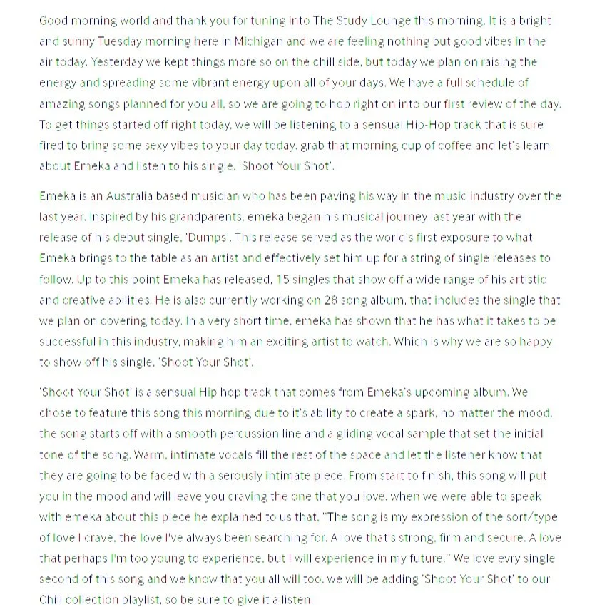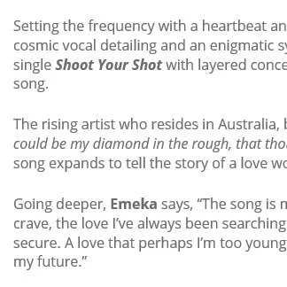 “With his unique flow, Emeka delivers a performance is both fun and inspiring. Emeka’s natural charisma combined with a beautiful instrumental to create an uplifting track, tremendously pleasing to the ear.”