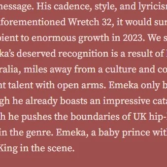 “He already boasts an impressive catalogue of over 20 songs; songs in which he pushes the boundaries of UK hip-hop, in his quest to find his spot within the genre. Emeka, a baby prince within UK rap, could one day ascend to a King in the scene.”